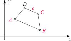 Aufgabe: Von einem Trapez (d.h. einem Viereck, in dem zwei Seiten zueinander parallel sind) sind, gemäß der nebenstehenden Skizze, die Punkte A, B, C und die Seitenlänge c gegeben. Gesucht ist der Punkt D. Man löse das Problem allgemein (d.h. durch eine Formel).