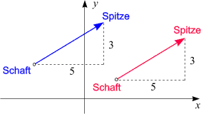 Wir können irgendeinen Punkt der Zeichenebene wählen und von diesem aus soweit in die x-Richtung gehen, wie die erste Komponente angibt, und soweit in die y-Richtung, wie die zweite Komponente angibt. In unserem Beispiel heißt das: "5 nach rechts, 3 nach oben gehen". Den Ausgangspunkt nennen wir Schaft, den Zielpunkt Spitze. Da der Ausgangspunkt beliebig ist, stellt das Zahlenpaar (5, 3) jeden Pfeil dar, der auf diese Weise entsteht. In der Skizze rechts haben wir zwei solcher Pfeile für verschiedene Ausgangspunkte gezeichnet. Jeder der beiden Pfeile wird vom selben Vektor, nämlich (5) dargestellt.