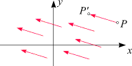 2. Als Verschiebungsvektor: Ist ein Vektor a gegeben, so können wir ihn dazu benutzen, jeden Punkt der Ebene um ein Stück zu verschieben. Dazu fassen wir einen beliebigen Punkt P als Schaft auf, hängen einen Pfeil, der den Vektor darstellt, dran, und verschieben den Punkt bis zur Spitze P '. Auf diese Weise entsteht eine Verschiebung (Translation) aller Punkte der Ebene in die gleiche Richtung und um die selbe Strecke.