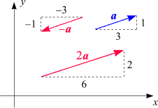 Auf diese Weise kann jeder zweikomponentige Vektor durch Pfeile dargestellt werden. Ist eine seiner Komponenten negativ, so wird vom Schaft in die entgegengesetzte Richtung (nach links bzw. nach unten) gegangen, ist eine Komponente 0, wird der entsprechende Zug ausgelassen. Da die zweikomponentigen Vektoren so schön in die Zeichenebene passen, nennt man sie auch ebene Vektoren.