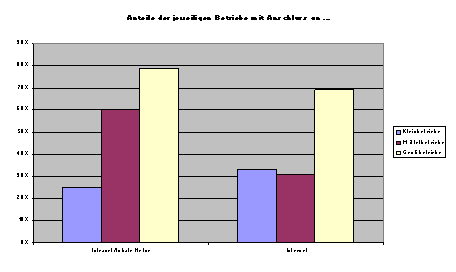 In klein- und mittelständischen Unternehmen (KMU) sind solche Weiterbildungsformen weit weniger stark verbreitet als in Großunternehmen und auch die weitere Entwicklung erscheint angesichts spezifischer Barrieren und Problembereiche weniger deutlich vorgezeichnet als in Großunternehmen. Lediglich 7% der KMU nutzen netzgestützte Lernapplikationen; weitere 8% planen oder erwägen zumindest den Einsatz von Telelernen in der betrieblichen Weiterbildung. Aus quantitativen Erhebungen in Unternehmen ist ersichtlich, dass diese Anteile mit steigender Unternehmensgröße zunehmen. Nahezu die Hälfte der KMU will solche neuen Lernmedien in absehbarer Zukunft nicht einsetzten.